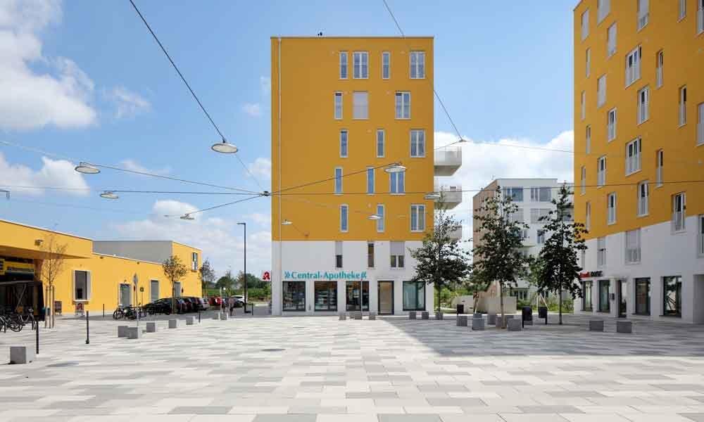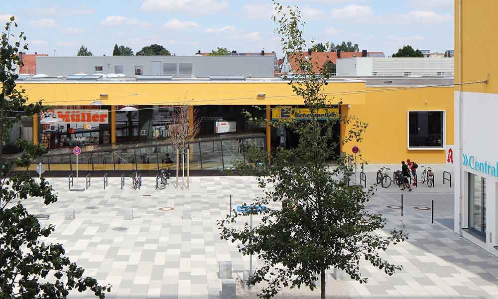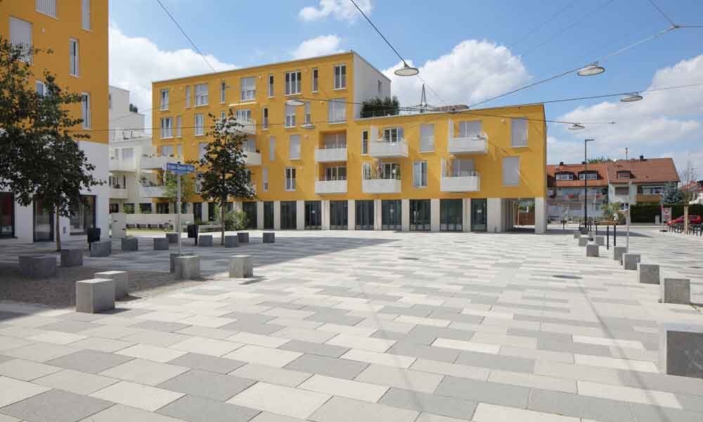 Das Zentrum der Neuen Mitte ist der Bruno-Danzer-Platz. Mit der Modernisierung des Stadtkerns lässt Karlsfeld seinen traditionellen, dörflichen Charme ein bisschen in den Hintergrund rücken. Schon länger ist es eigentlich zur Kleinstadt geworden und jetzt soll es auch architektonisch einen modernen, urbanen Mittelpunkt erhalten.
