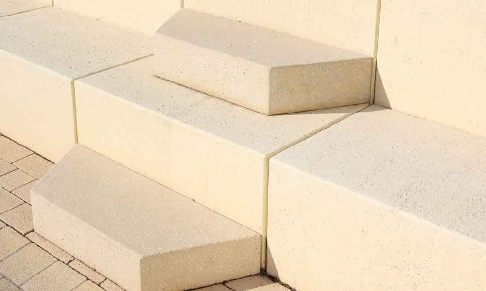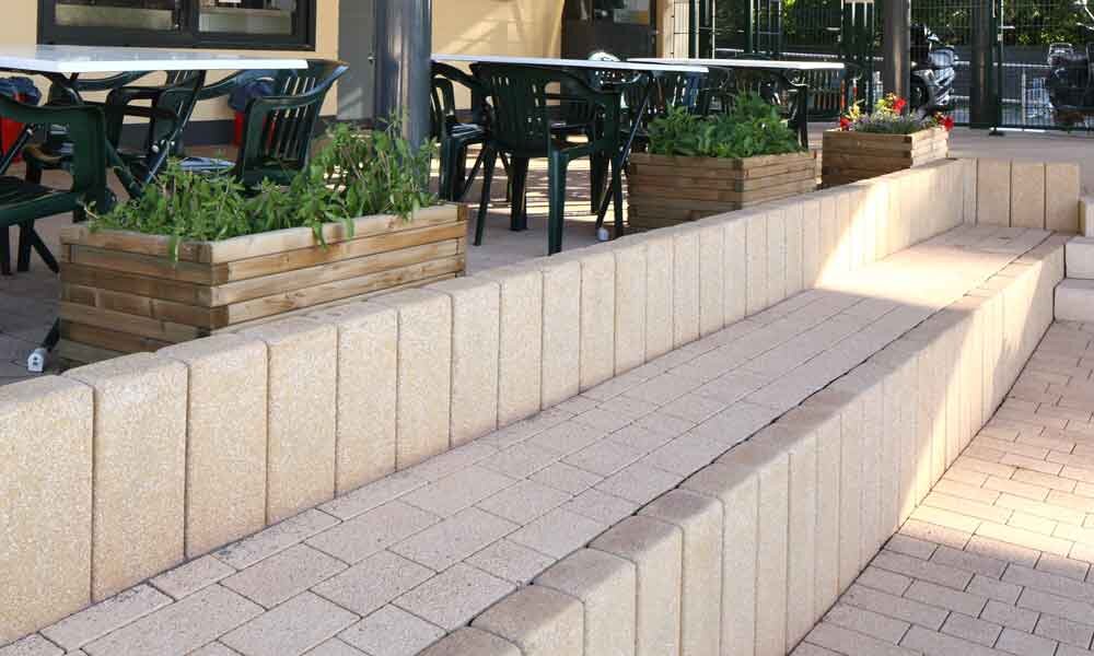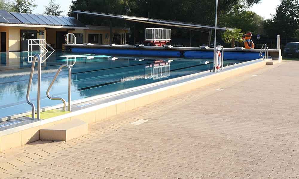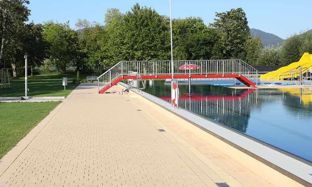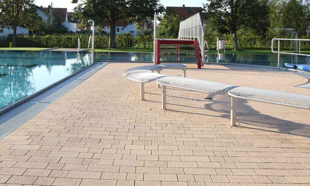 Hier passt wirklich alles zusammen! Bei der Gestaltung des Freibads wurde besonderer Wert auf eine durchgängig abgestimmte Farbgebung gelegt. Ein zarter Juraton zieht sich durch alle Bereiche und schafft ein Wohlfühlgefühl nach dem Vorbild südlicher Gefilde. Kinder spielen hier in einem beheiztem Becken, das über zwei Ebenen reicht und über eine Wasserrutsche verbunden ist. Für die Schwimmer stehen zwei 50 m-Bahnen und vier 25 m-Bahnen zur Verfügung. Speziell angefertigte Sonderstufen erleichtern den Weg in die Becken. Gestalterisch wirkt alles aus einem Guss. Die Umkleidebereiche sind mit zum Pflastersystem passenden Platten belegt, Höhenunterschiede und Hochbeete werden mit farbgleichen Palisaden erstellt. Sogar die Entwässerungsrinnen sind in gleicher Rezeptur wie der umgebende Belag hergestellt.