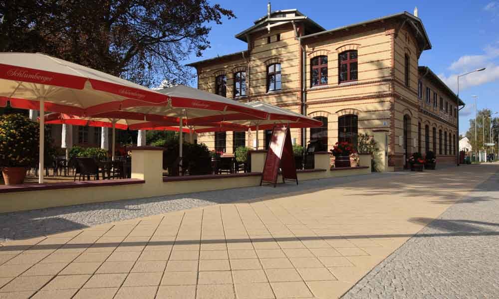 Weg mit Aussicht. Die Schlosspromenade folgt dem Burgsee und gibt an der einen oder anderen Stelle einen wunderschönen Blick auf das Schweriner Schloss frei. Mit der Anlage dieses Weges wurde ein weiterer Schritt zur Steigerung der Attraktivität der wassernahen Flächen getan. Die Promenade ist mit einem eleganten Pflaster mit gelblichem Natursteinvorsatz versehen, deren Fläche durch dunkle Steinreihen kontrastreich unterbrochen wird. Hierdurch entsteht eine gewisse Lockerheit. Große Pflanzinseln schaffen als grüne Oasen einen zusätzlichen Hingucker.