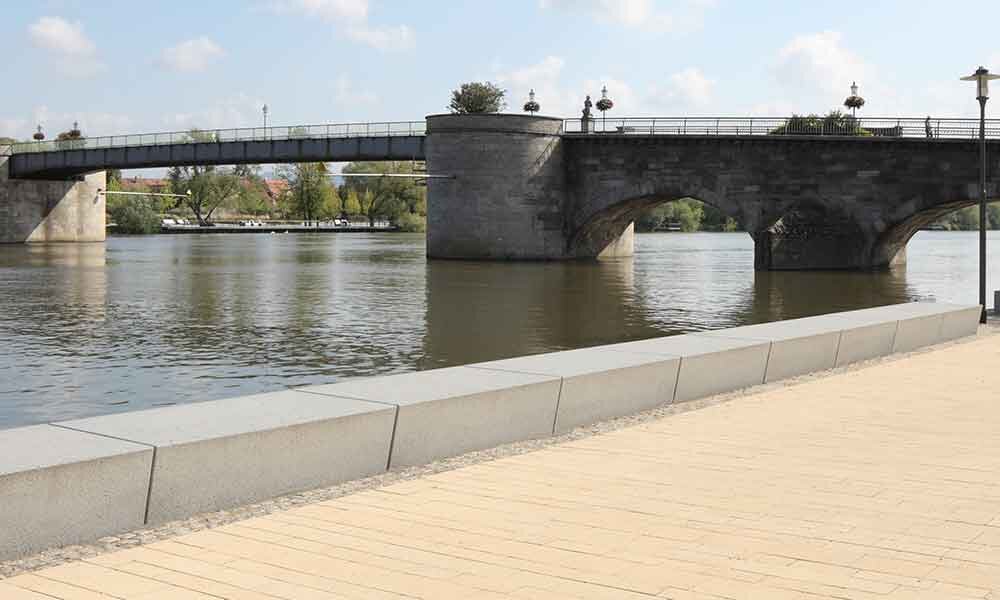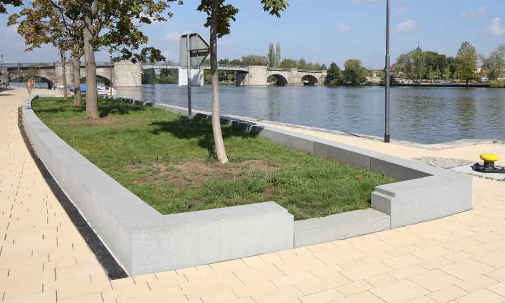 Die Gestaltung fügt sich mühelos in die Umgebung ein, denn viele Elemente, die Besucher zum Verweilen einladen, sind harmonisch eingebracht. So zum Beispiel die zahlreichen Sitzmöglichkeiten. Sei es das Mobiliar in Form eines Schiffskörpers oder die parallel zum Ufer verlaufenden Sitzblöcke. Beide Modelle bieten einen wunderbaren Kontrast zu dem eher schlicht gehaltenen Bodenbelag in einem zarten Beige- und Grauton.