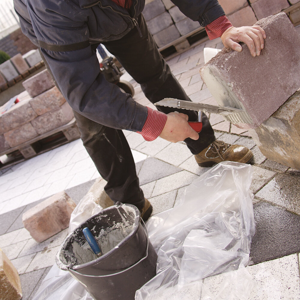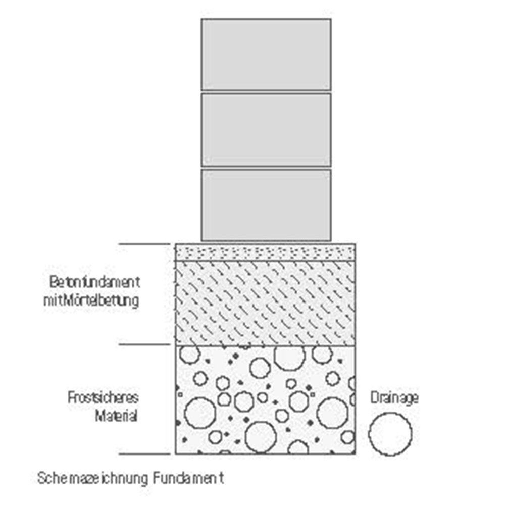 Die Mauersteine werden mittig auf ein frostfrei gegründetes Betonfundament gesetzt. Die Abmessung des Fundamentes ist abhängig von der späteren Belastung (siehe Statik).
