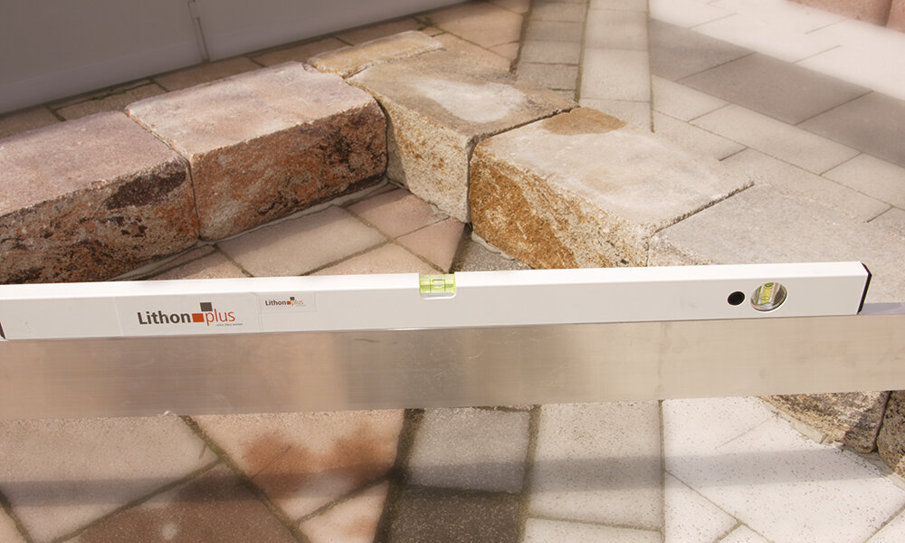 Nach dem Versetzen der ersten Reihe wird mit der Richtlatte die Ebenheit kontrolliert. Dabei sollte auch die Höhengleichheit über die Ecken überprüft werden (Abb. 2).