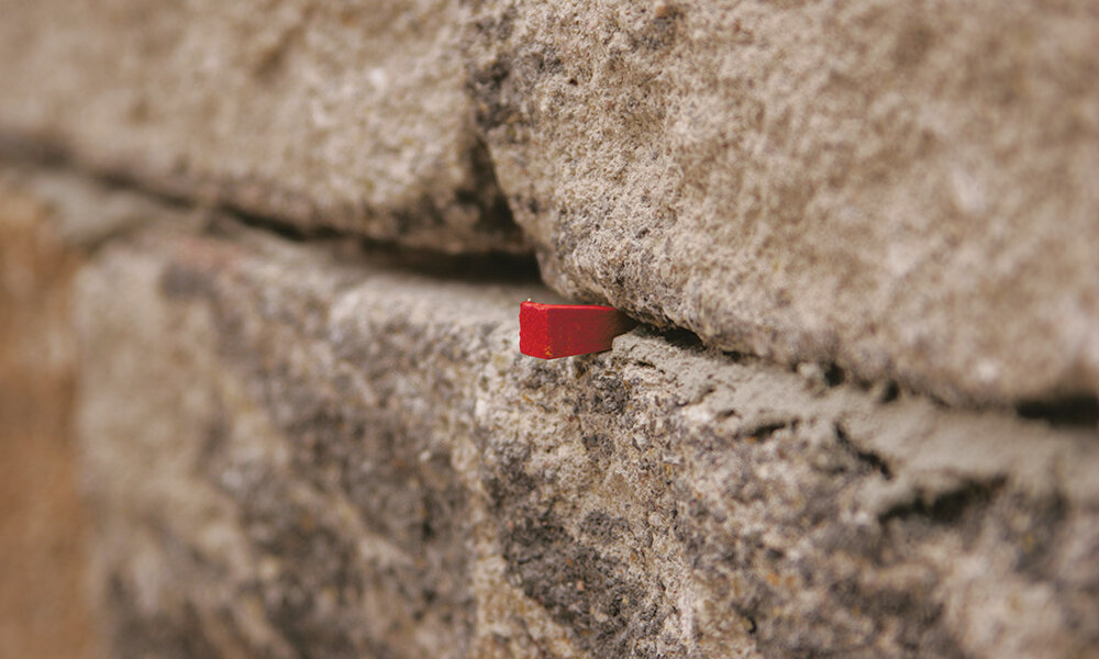 Nach dem Ausrichten der ersten Lage werden die weiteren Lagen mit einem Mittelbettmörtel (Mörtelgruppe III) winkel- und fluchtgerecht versetzt. Der Mittelbettmörtel für die Lagerfugen wird mittels eines Zahnspachtels aufgebracht. Um die Steinflanken nicht zu verschmutzen, sollte man den Mörtel nicht bis zum Rand aufziehen, sondern jeweils ca. 1 cm Abstand lassen (Abb. 4). In der Praxis hat sich das Fixieren mit kleinen Fliesenlegerkeilen bewährt, um Höhenunterschiede der Mauersteine auszugleichen (Abb. 5). Aufbauanleitung und Aufbaukit mit Kunststoffkeilen liegen jeder Lieferung bei.