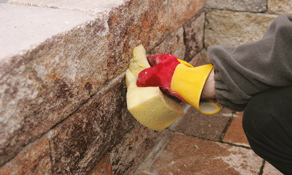 Nachdem die Mauersteine versetzt wurden, sollten am Mauerkopf die Stoßfugen verfugt werden (Abb. 8). Dies verhindert den Wasserzutritt und die Staunässe in der oberen Schicht. Nachdem der Mörtel etwas angezogen hat, wird überstehender Mörtel an allen Stoß- und Längsfugen mit einem kleinen Spachtel abgekratzt und mit einem Schwamm abgewaschen (Abb. 9). Ist ein vollfugiges Erscheinungsbild der Mauer gewünscht, wird Mörtel von außen in die Fugen gedrückt und die Steine nach dem Anziehen des Mörtels mit einem Schwamm abgewaschen.