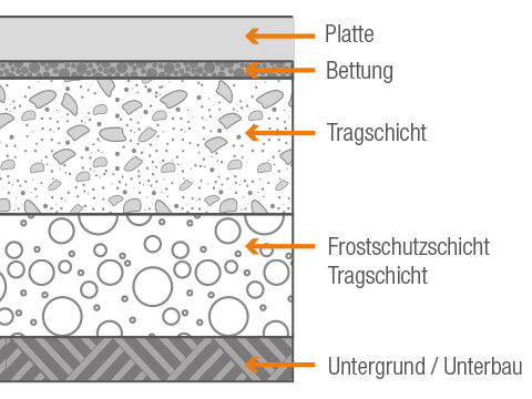 Plattenflächen erhalten ihre Stabilität durch den sorgfältigen Einbau der Materialien unterhalb des Plattenbelags. Die Tragschicht nimmt Belastungen auf und leitet sie an den Untergrund weiter. Durch die Dicke der Tragschicht wird auch der Anforderung an die Frostsicherheit entsprochen.