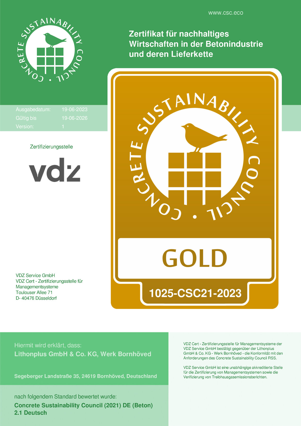 Alle 16 Produktionsstandorte von Lithonplus sind mit dem Zertifizierungsniveau "Gold" des Concrete Sustainability Councils (CSC) ausgezeichnet worden. Damit wird eine herausragende Nachhaltigkeits-Performance für nachhaltiges Wirtschaften in der Betonindustrie und deren Lieferkette bescheinigt. Vorausgegangen waren intensive Prüfungen und Audits durch die Zertifizierungsstelle der VDZ Service GmbH.