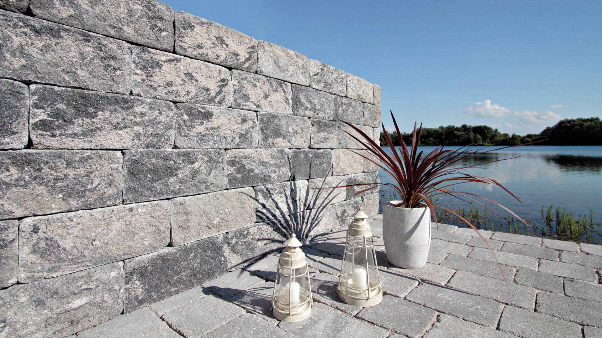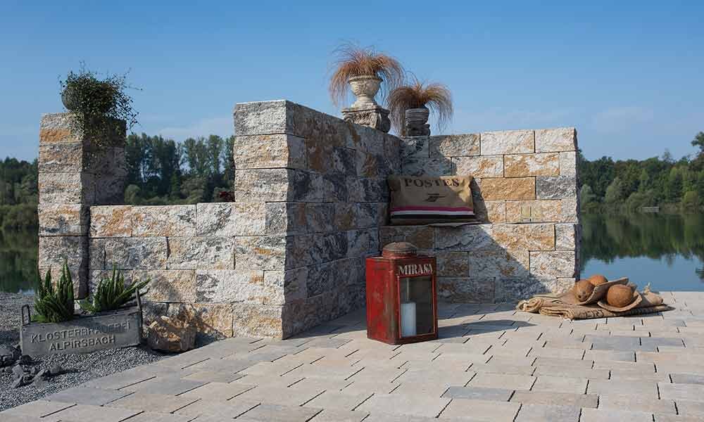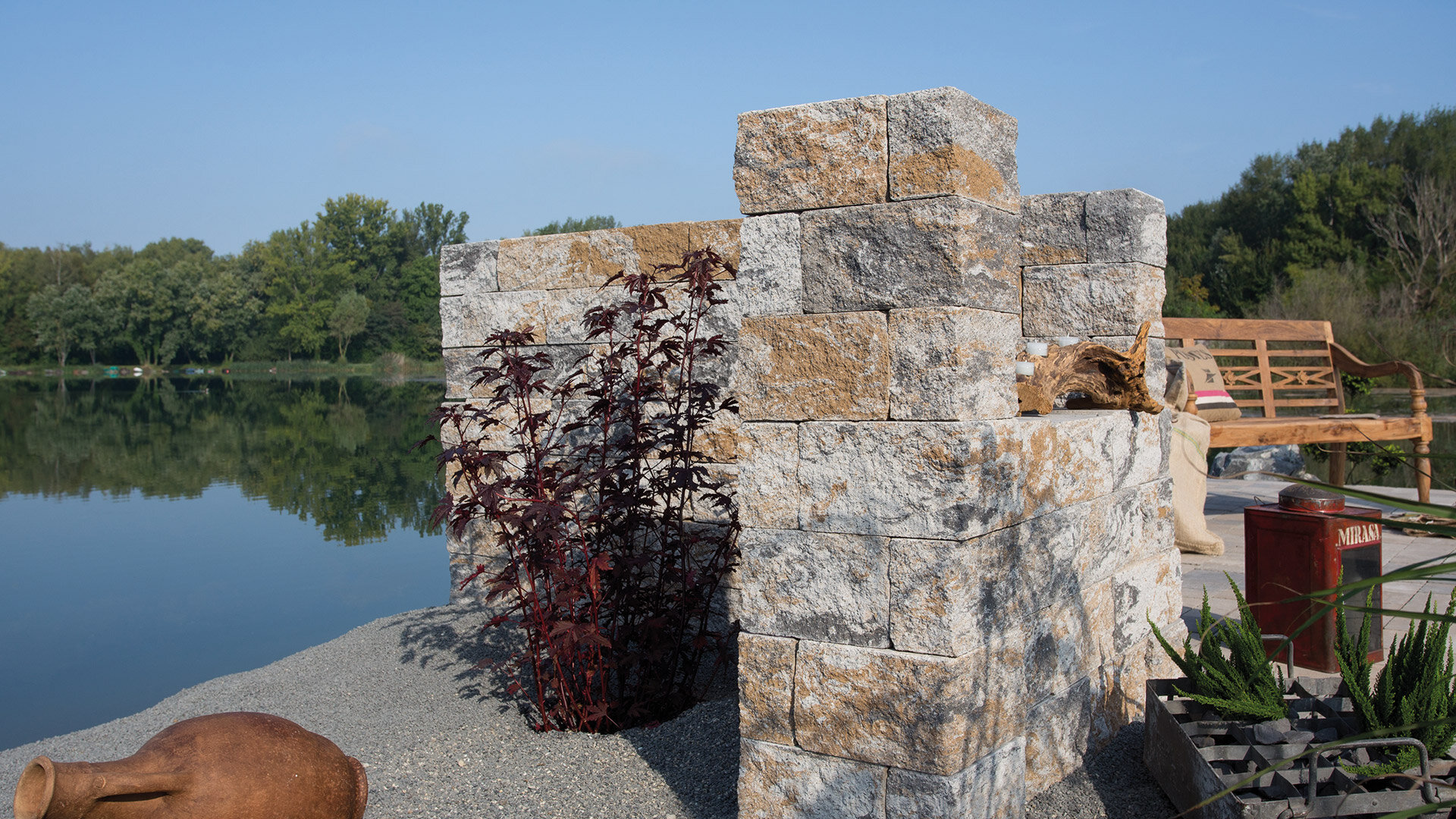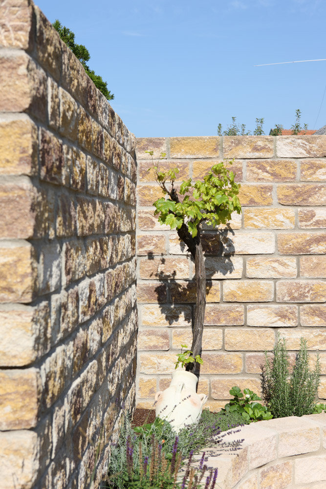Die Vino Mur besitzt besonderen Charme. Ihre unnachahmliche, natürliche Optik wird durch die formschönen Steingrößen mit den bossierten Sichtflächen erreicht. Die warme Farbgebung mit nuancierenden Mischfarben unterstützt zusätzlich die einzigartige Ausstrahlung. Vino Mur kann als freistehende Mauer, Böschungsbefestigung oder Sichtschutz eingesetzt werden. Die Mauerbreite beträgt 25 cm.