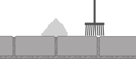 Die Fugen werden mit einem gewaschenen, nicht färbenden Fugmaterial gefüllt. Das Einbringen des Materials erfolgt kontinuierlich, jedoch nach Ausrichten des Fugenverlaufes, durch Einfegen mit dem Fortschreiten der Verlegearbeiten. Die Fugen sind vollständig zu füllen. Kornabgestufte Fugenmaterialien (Größtkorn mind. 4 mm) sind zu bevorzugen. Sie müssen filterstabil zum Bettungsmaterial sein.