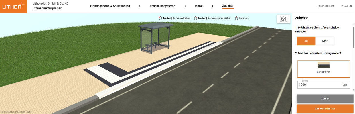 Am Ende der Planung erhalten Sie einen PDF-Export mit Ansichten und Materialbedarf zur Angebotserstellung. In der zweiten Ausbaustufe können Sie auch Überquerungsstellen konfigurieren. Mit unserem Infrastrukturplaner sparen Sie Zeit in der Bauplanung und sichern sich eine klare Vorstellung der Umsetzung. Starten Sie jetzt und konfigurieren Sie Ihre Bushaltestelle!