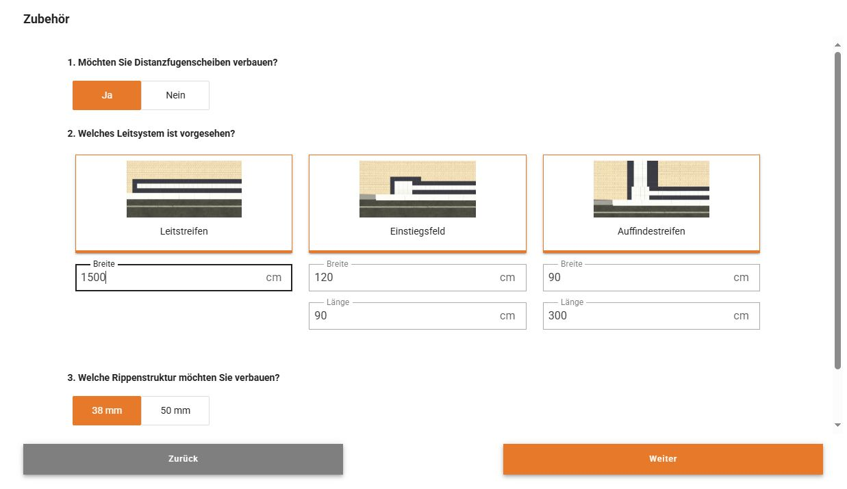 2: Definieren Sie die jeweiligen Maße von Leitstreifen, Einstuegsfeld und Auffindestreifen.