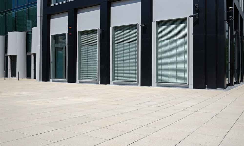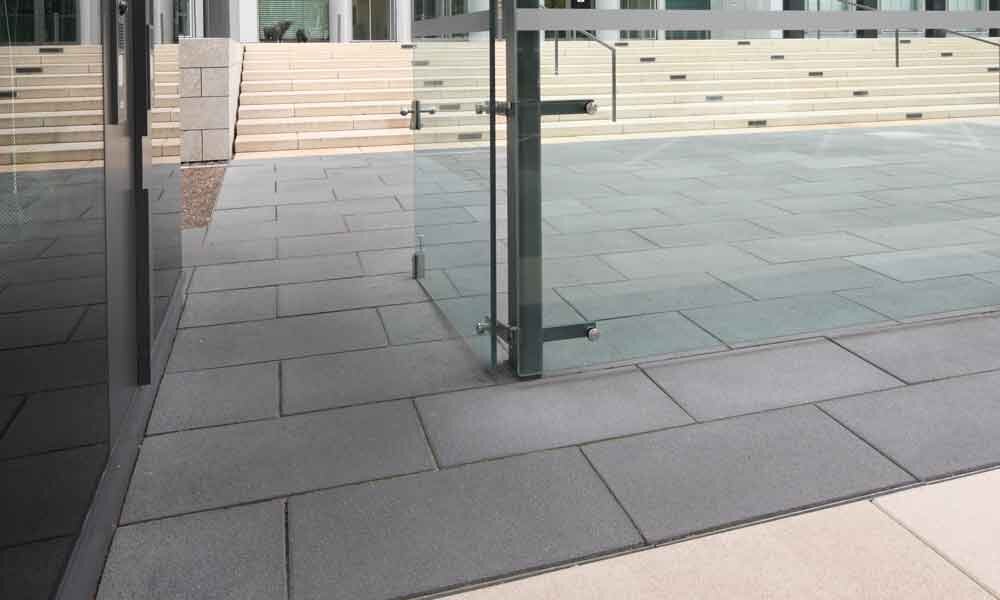 Konsequent fortgesetzt wird die Gestaltungslinie in der Außenanlage. Die Flächenbeläge orientieren sich farblich an der Sockelmauer aus Sandstein. Die Platten wurden im Kreuzverband eingebaut und nehmen damit im Verlegemuster das Raster der Fassade wieder auf.