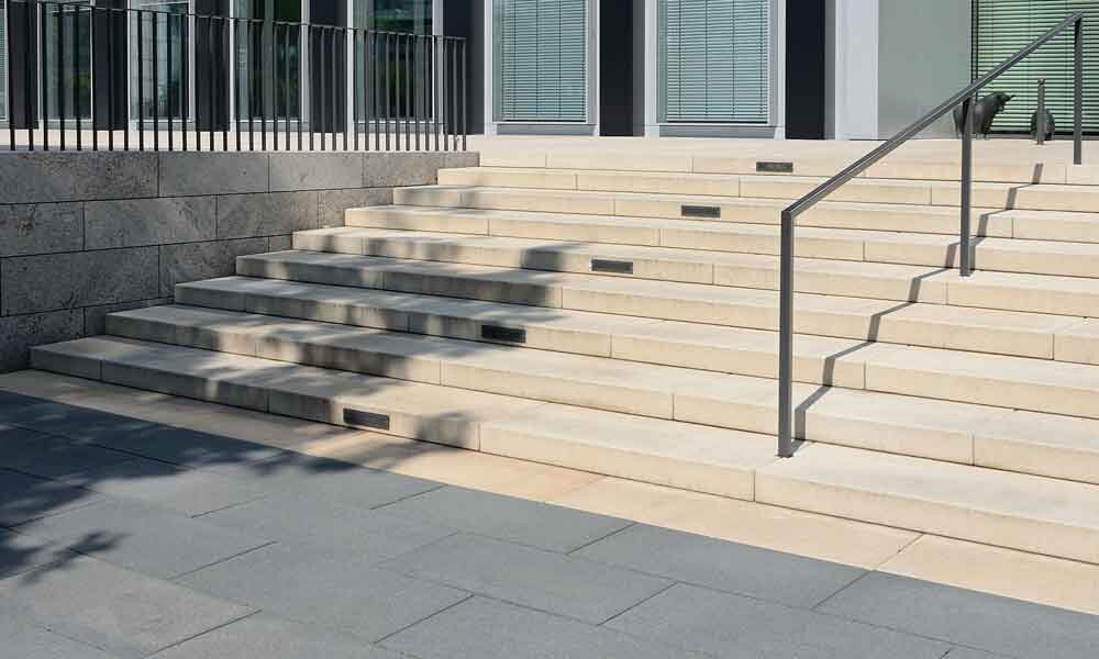 Eine gestalterische Führungsrolle nimmt die breite Freitreppe ein, die farblich exakt auf den Bodenbelag abgestimmt ist und durch die eingebaute Beleuchtung zusätzlich betont werden kann. Der Bereich vor der Treppe ist mit großformatigen Platten in der Farbe basaltanthrazit befestigt. Für die letzte Plattenreihe vor der Treppe wurde für einen harmonischen Übergang bereits der helle Farbton gewählt.