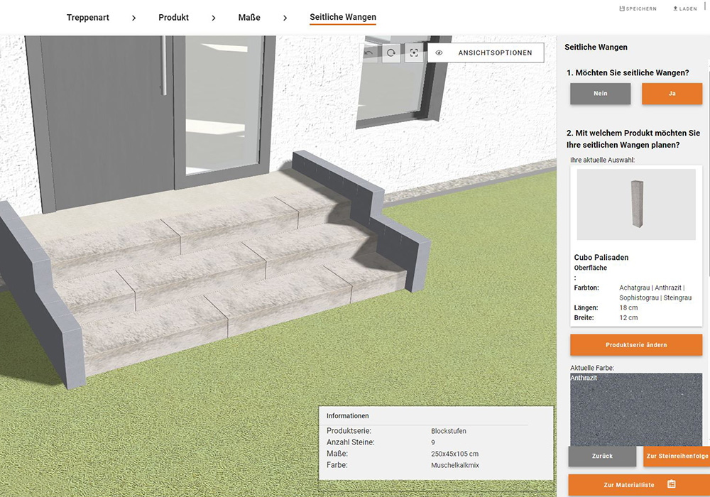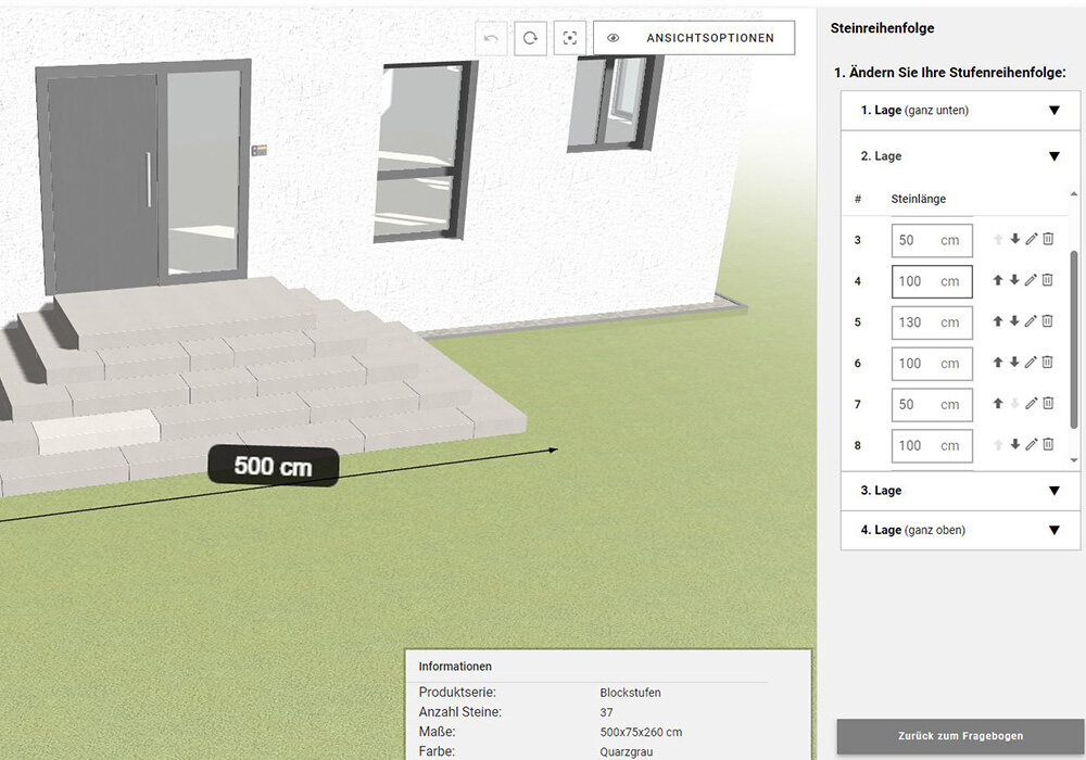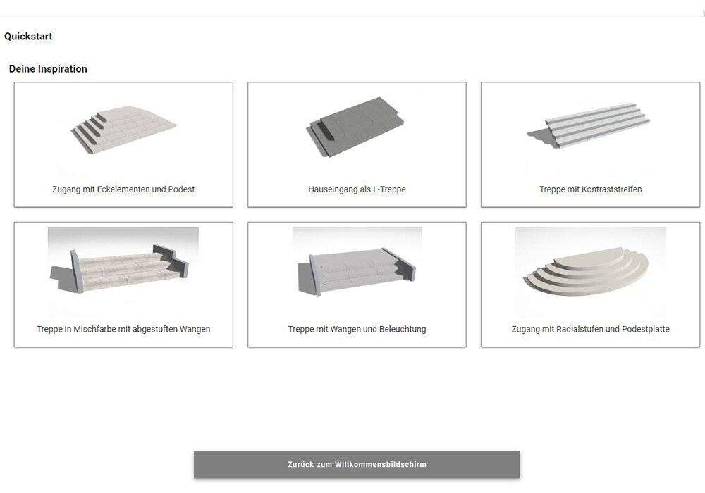 Mit dem Treppen Konfigurator können Sie Ihre individuelle Treppe in wenigen Schritten online planen. Egal ob Hauszugang, Gartenweg oder eine komplexe Stufenanlage – unser Treppenplaner bietet Ihnen die Möglichkeit, Stufenanlagen nach Ihren Vorgaben zu perfektionieren. Wählen Sie zwischen Blockstufen, Radialstufen und weiterem Zubehör wie Podestplatten, Beleuchtung oder Fußabstreifern, um Ihre Treppe nach Maß zu konfigurieren. Dank unserer vielfältigen Projektbeispiele gelingt der Einstieg in die Konfiguration besonders leicht.