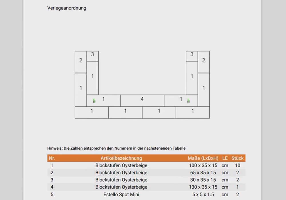 Am Ende der Planung erhalten Sie einen individuellen Verlegeplan mit Visualisierung und einer detaillierten Stückliste. Mit unserem Treppenplaner sparen Sie Zeit in der Bauplanung und sichern sich eine klare Vorstellung der Umsetzung. Starten Sie jetzt und konfigurieren Sie Ihre Treppe!