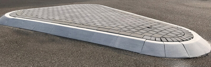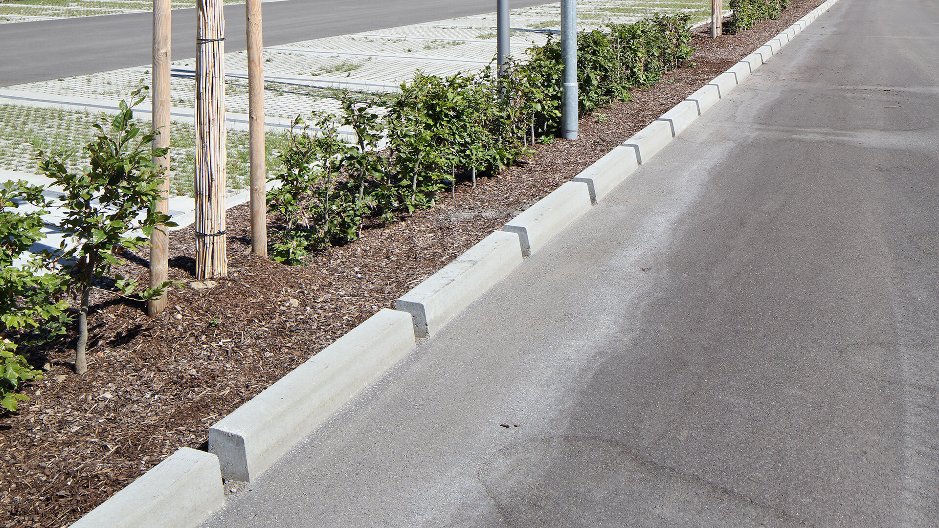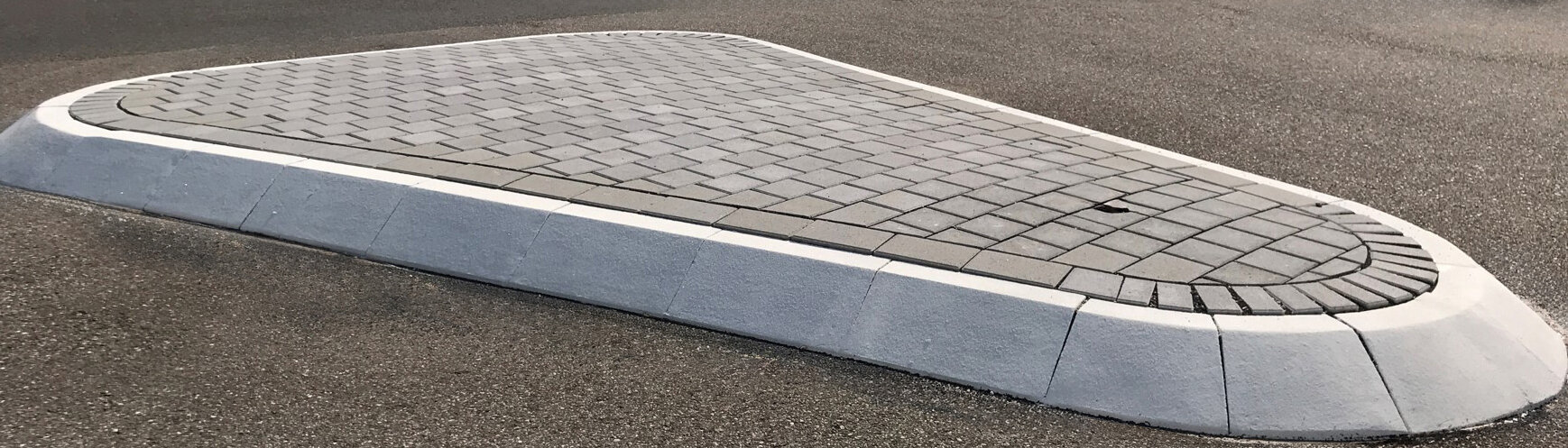 Flachbordsteine werden bevorzugt in Verkehrsleitsystemen und Kreisverkehren eingesetzt. Das System basiert auf dem Flachbord F15 (Anlauf 15 cm).