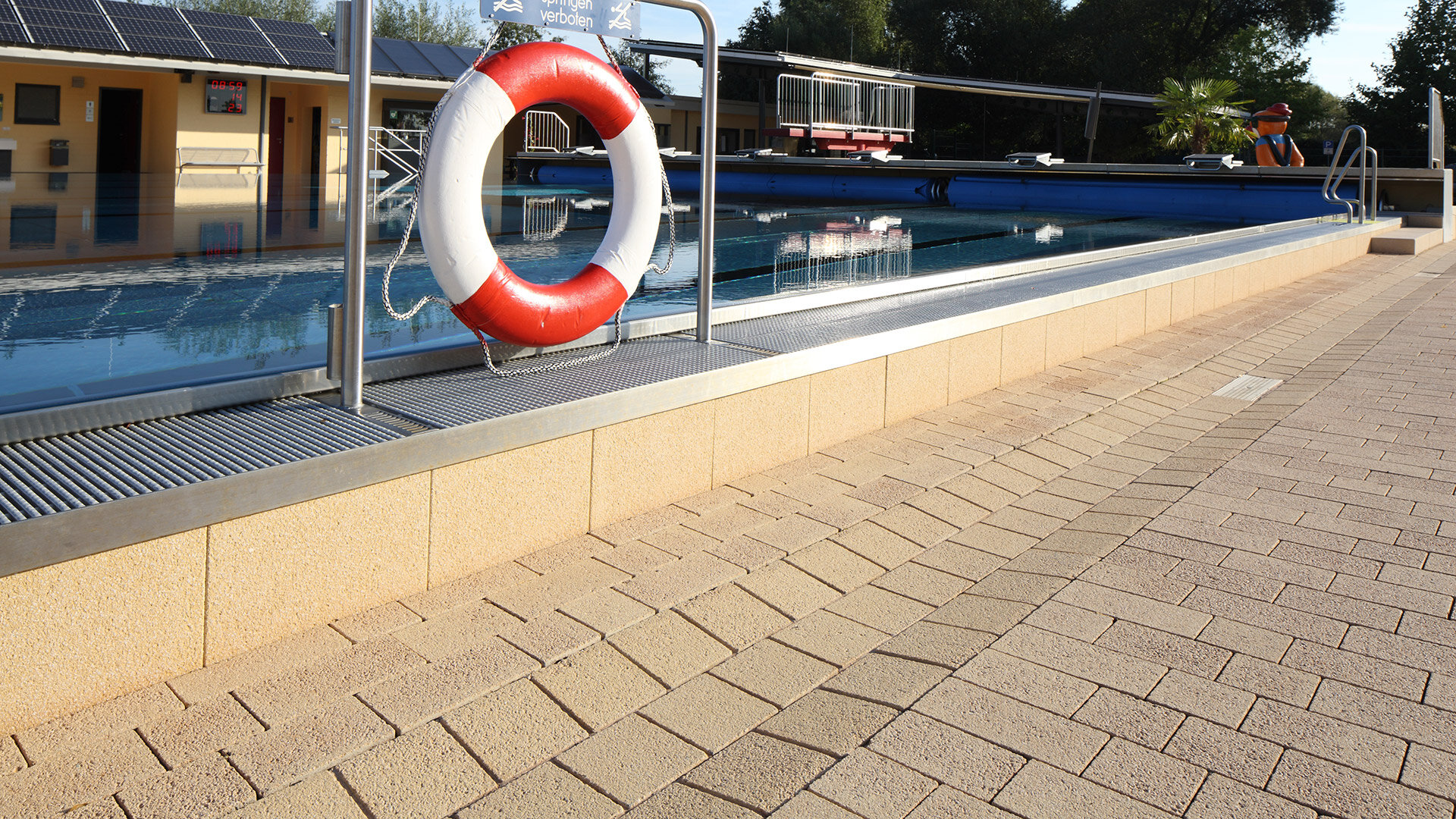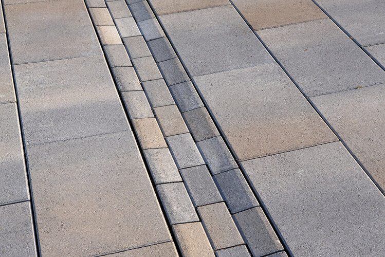 Safeline+ erfüllt die Anforderungen der DIN 18040-3 an barrierefreies Bauen. Das Hauptelement ist ein 50 cm breiter Systemverband, der durch die Anordnung von Scheinfugen die Wirkung von sechs Einzelsteinen erzeugt. Die Rinne hat den Wasserlauf bereits integriert, wodurch aufwändiges Ausrichten von Einzelsteinen entfällt. Umfangreiches Zubehör ermöglicht flexible Linienführungen. Das Abstandhaltersystem und die Profilierung an der Unterseite sorgen für dauerhafte Stabilität.