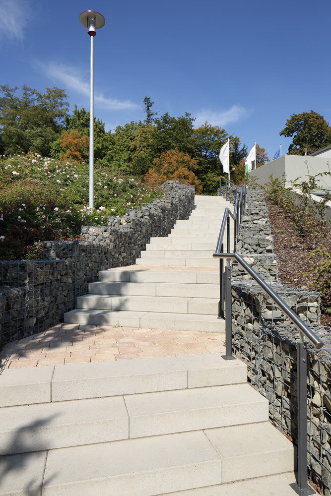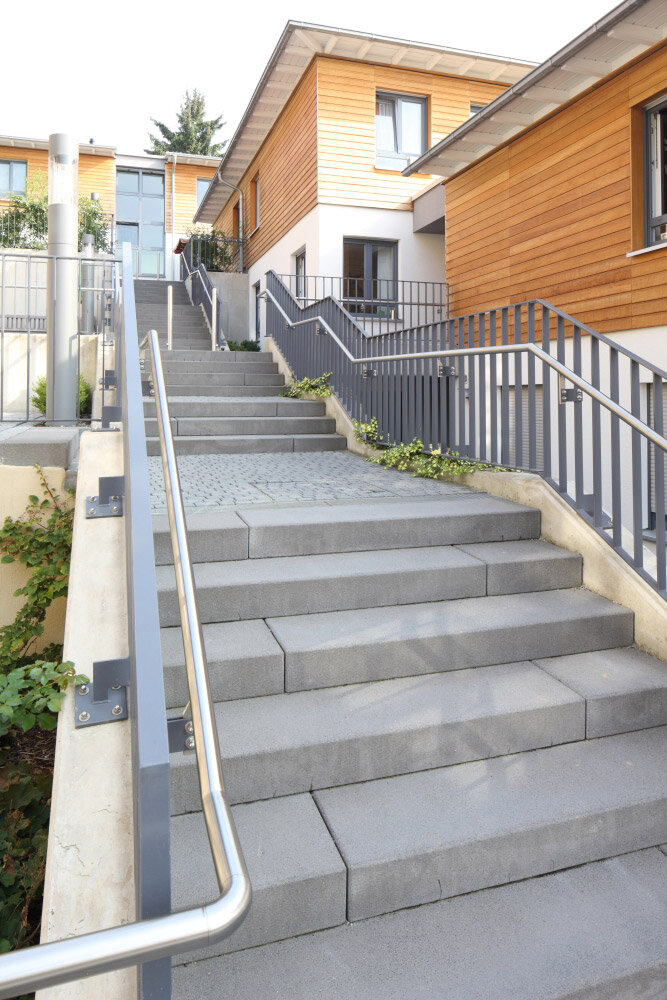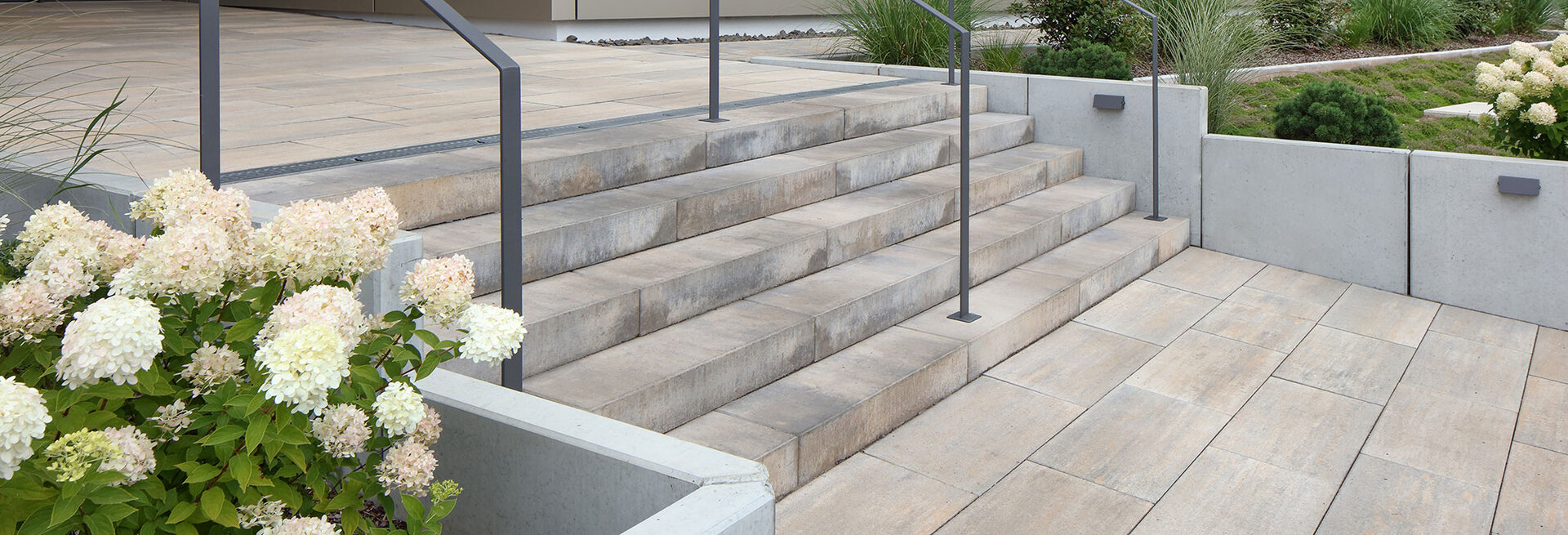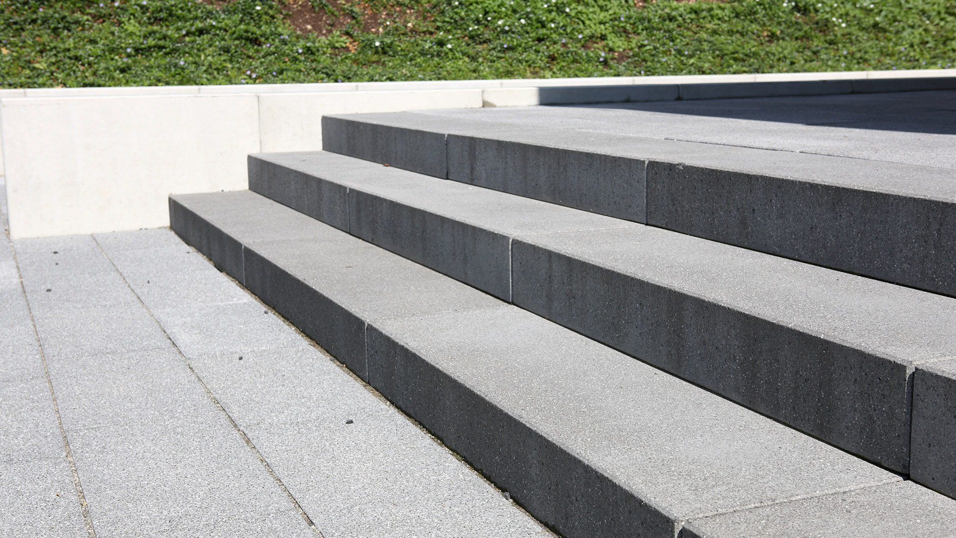 Großes Sortiment an Blockstufen in Standardgrößen bis 150 cm Länge. Erhältlich in kugelgestrahlter Oberfläche R13 und klassischer Betonoberfläche R12.