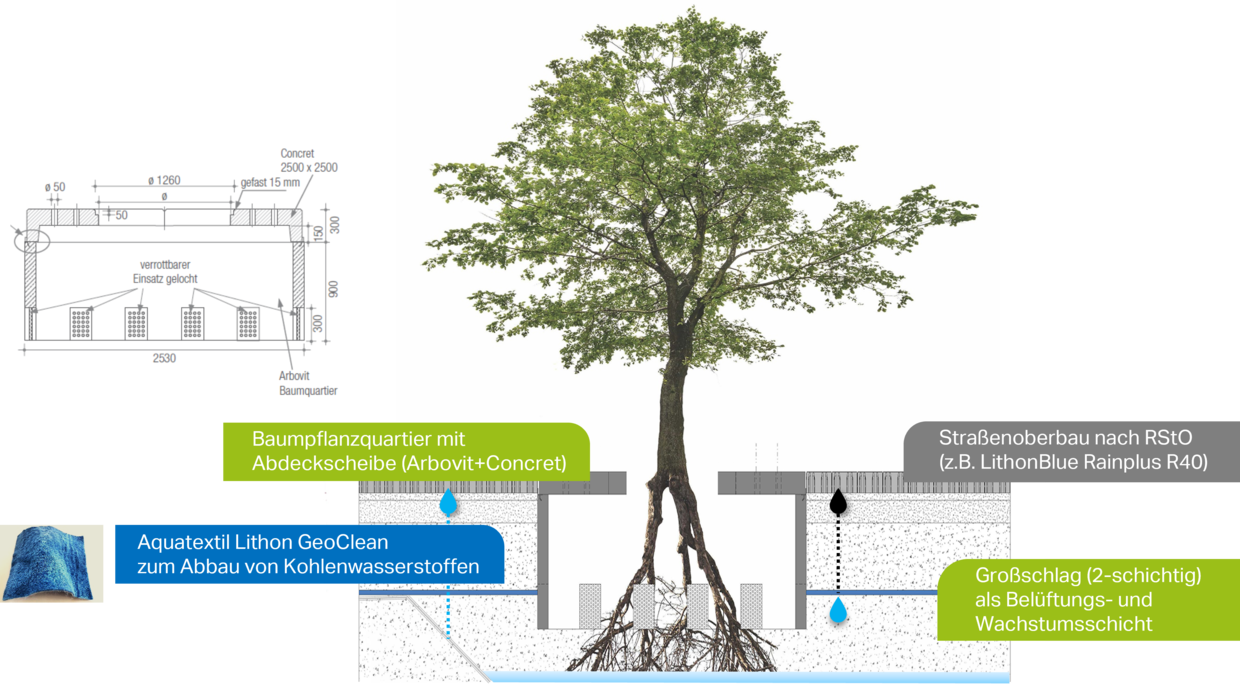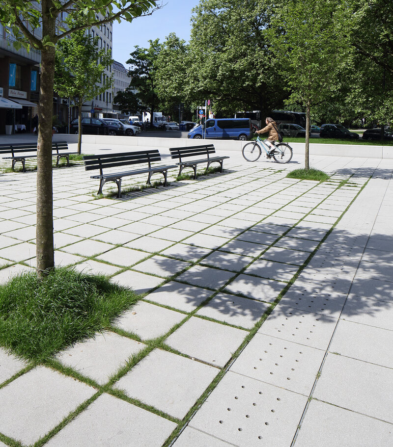 Das harmonische Miteinander von Bepflanzungen und Flächenbefestigungen ist das Ziel der Schwammstadt, wodurch auch in Zeiten des Klimawandels ein angenehmes Wohnen und Arbeiten in urbanen Zentren ermöglicht wird. Die Flächenbefestigungen können bei diesem Ansatz aufgrund der schadstoffabbauenden Filterschicht versickerungsfähig ausgebildet werden. Zudem werden Bepflanzungen aktiv eingebunden und Bäume durch Betonquartiere geschützt oder über Winkelstützelemente Tiefbeete ermöglicht.