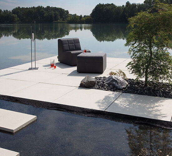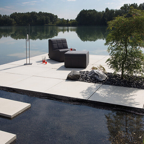Die exklusiven Titania-Platten stehen für Großzügigkeit und Exklusivität. Mit ihren geradlinigen Konturen und ihrer schlichten Sachlichkeit passen sie ideal zu weitläufigen Terrassen und punkten mit ihrem puristischen Design. Die Oberfläche aus hochwertigem Sichtbeton ist fein angeraut.