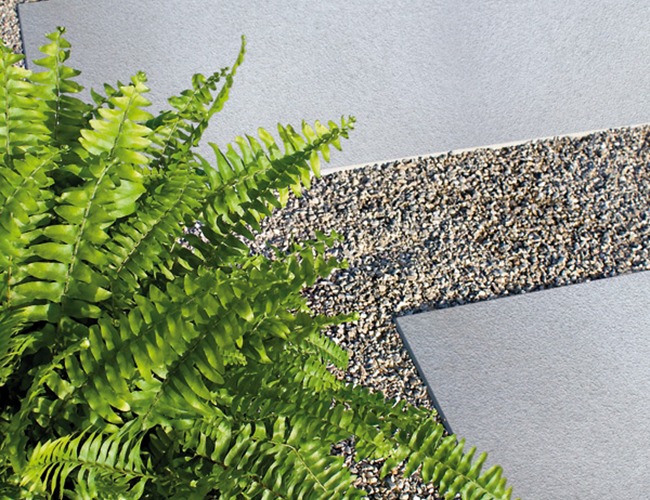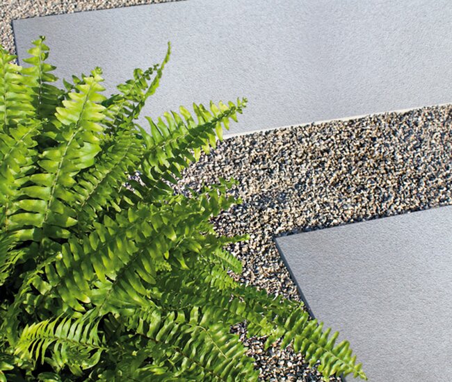 Für ein stimmiges Gesamtbild kann die Titania Terrassenplatte nahtlos mit Randplatten und Treppenstufen kombiniert werden.
