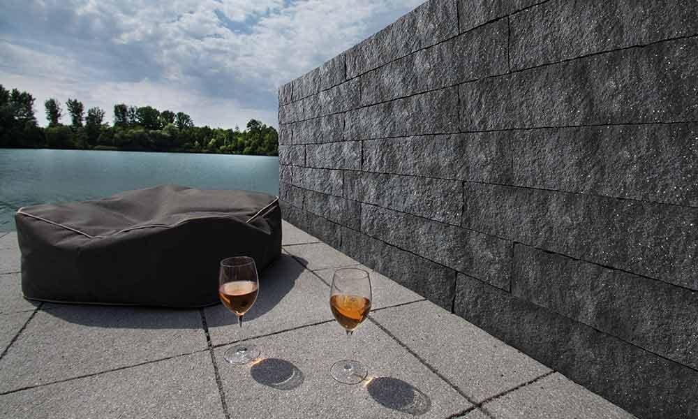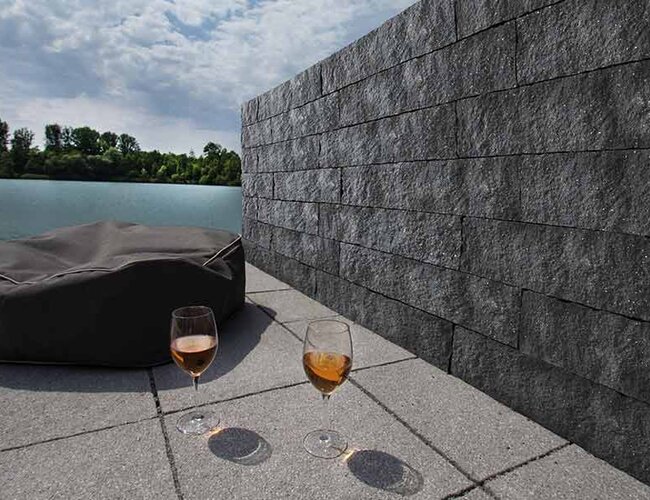 Das charakteristische, schlank proportionierte Längsformat bildet das zentrale Gestaltungselement der Trento Mur Long. De hochwertige Anmutung der edlen, leicht topografierten Naturstein-Oberfläche ermöglich Gartenmauern mit Design-Faktor. Passende Endsteine komplettieren das System.