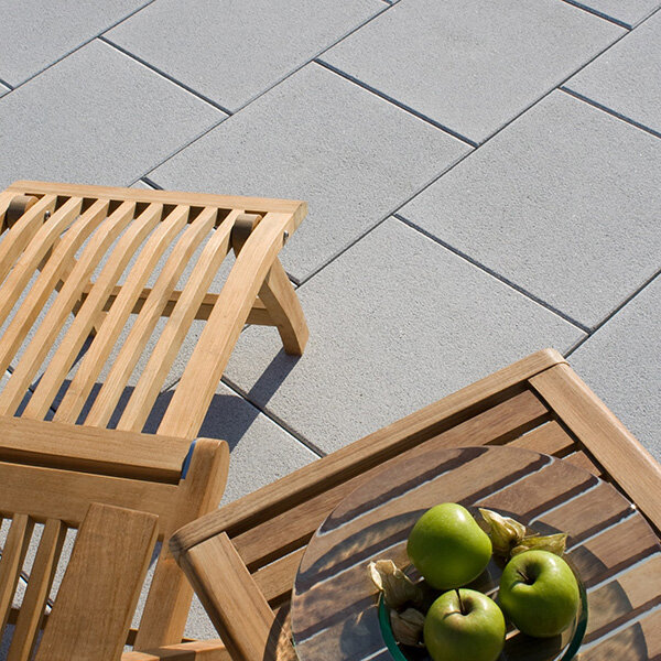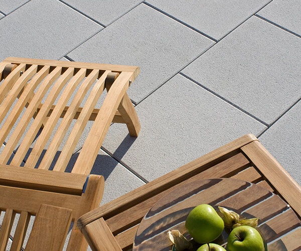 Fein gestrahlte Terrassenplatten mit ressourcenschonender Rezeptur in drei zeitlosen Farben.