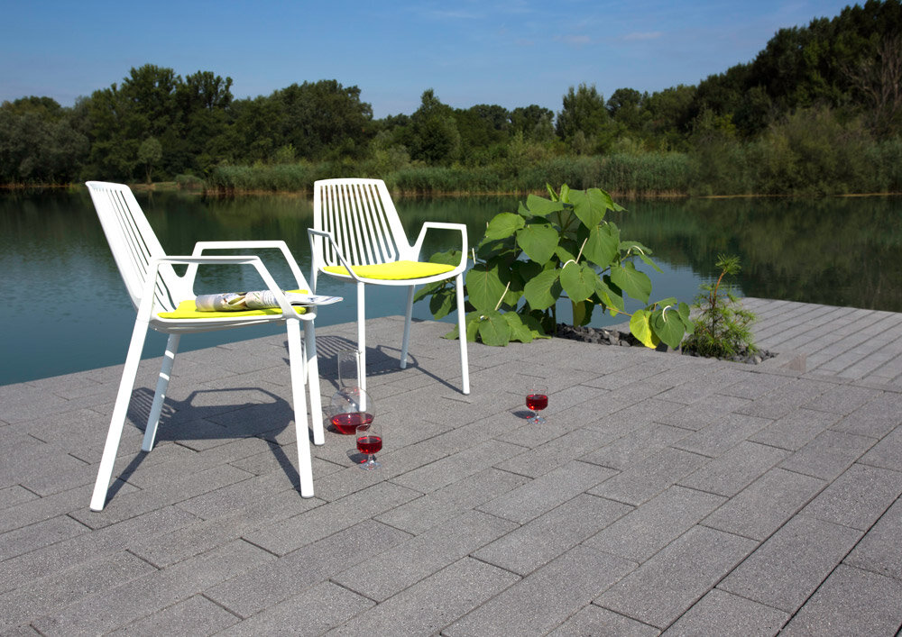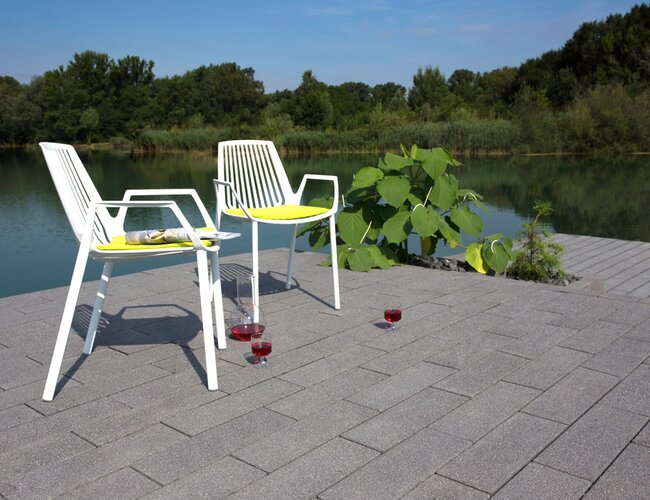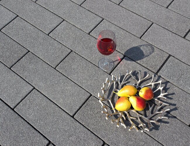 Alle mit den Vista-Steinen gepflasterte Flächen sind grundsätzlich von PKWs befahrbar. Für zusätzliche Stabilität und Nachhaltigkeit sorgt das seitlich integrierte Abstandhaltersystem. Dieses sichert die Mindestbreite der Fugen und macht die Steine versickerungsfähig. So kann Regenwasser durch die Fugen abfließen und vom Boden aufgenommen werden. Zum anderen verkanten sich die Sprossen des Abstandhaltersystems beim Verlegen der Pflastersteine und sorgen so für zusätzliche Stabilität der Fläche.