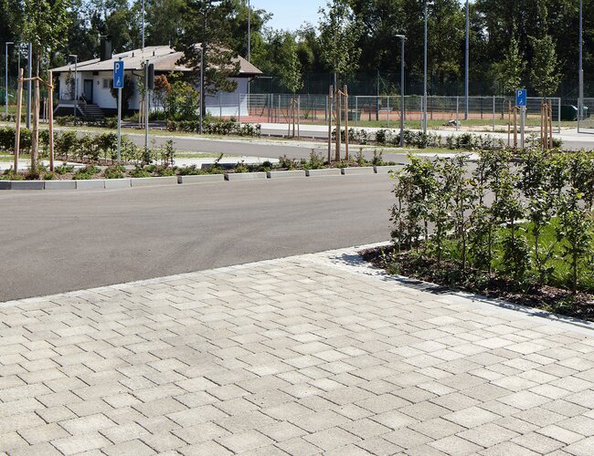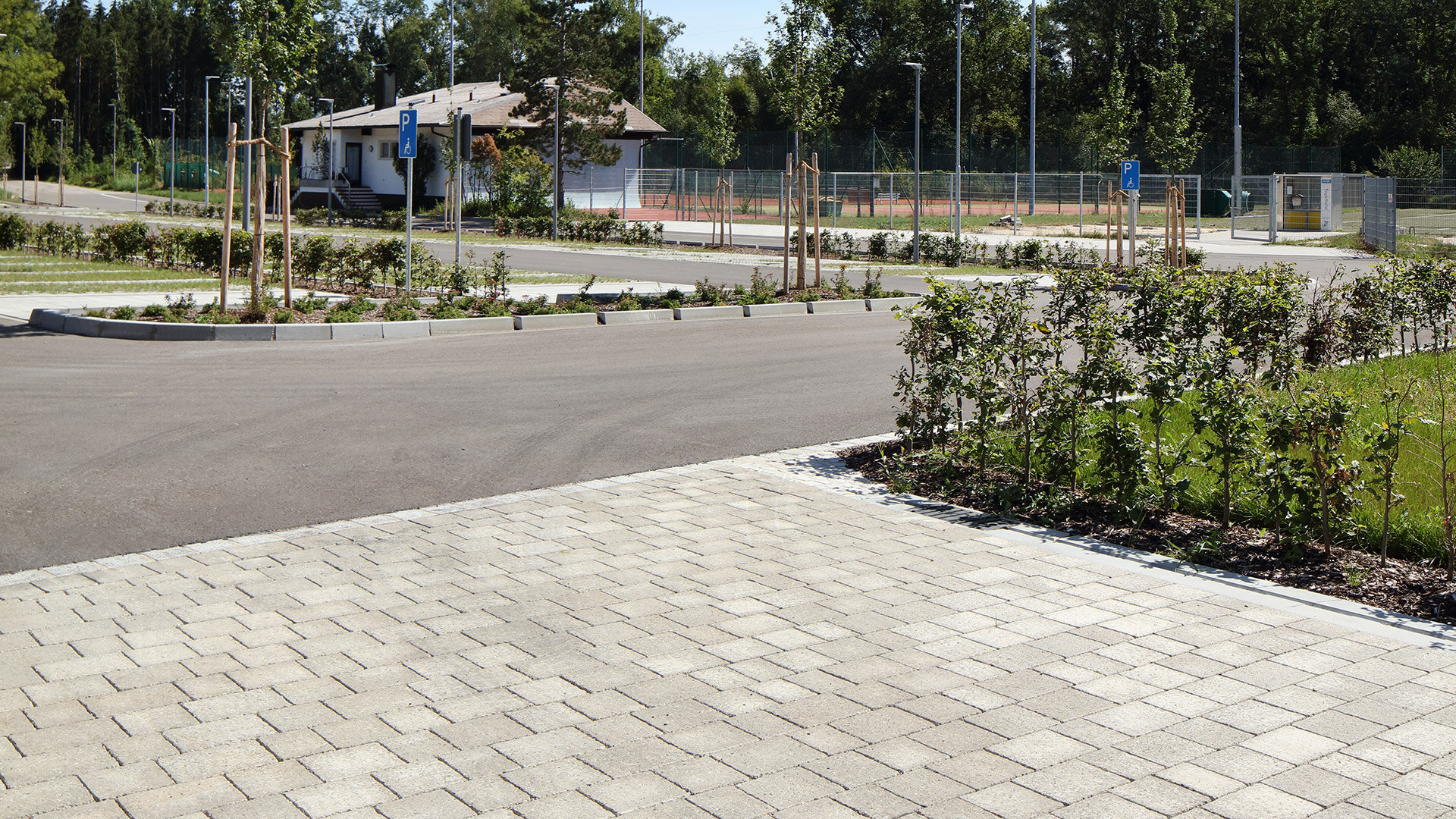 Reihenpflaster im Formatmix mit unterschiedlichen Farben und Oberflächen.