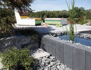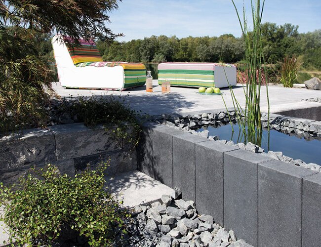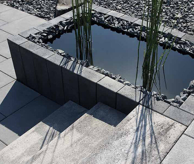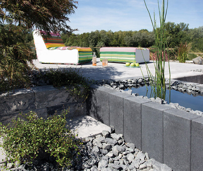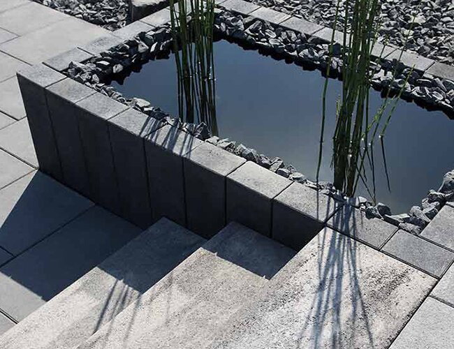 Moderne Palisadensteine aus Beton für Terrasse und Garten in 3 unterschiedlichen Höhen.