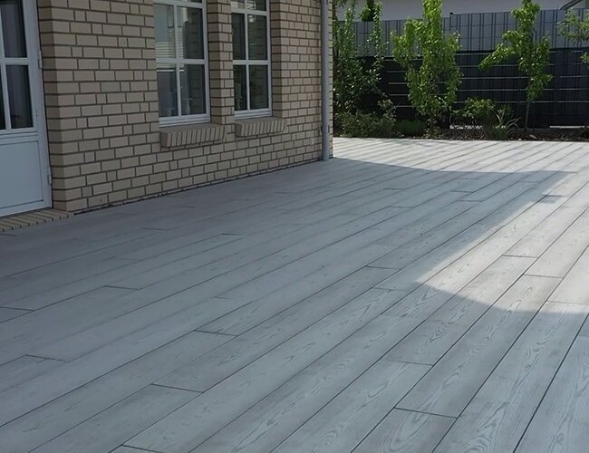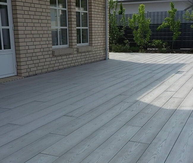 Unsere Terrassendielen überzeugen nicht nur mit ihren faszinierenden, an Holzmaserungen angelehnte Oberflächen, sondern auch mit ihrem modernen Format. Jede Betonplatte ist 2 Meter lang und 20 Zentimeter breit. So entsteht ein besonders stimmiges Gesamtbild mit natürlichem Look. Dank der Farbauswahl sind die Betondielen kaum von ihrem Vorbild zu unterscheiden, im Gegensatz zu Holzdielen steht die Variante aus Beton allerdings für Langlebigkeit und Robustheit bei gleichzeitig geringem Pflege- und Reinigungsaufwand.