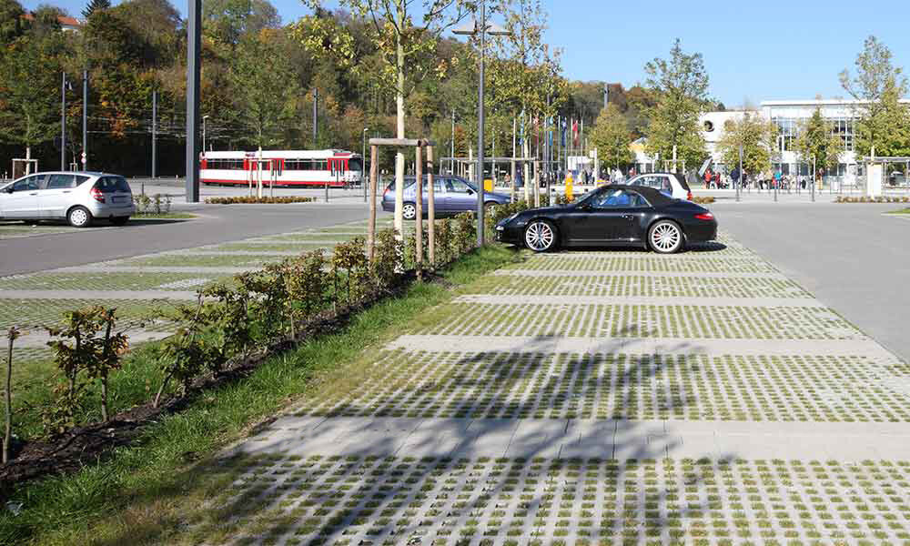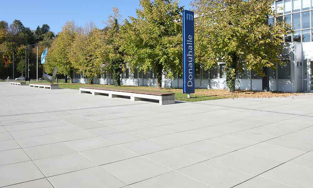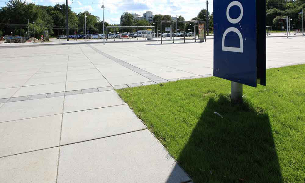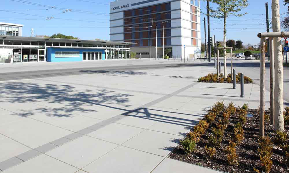 Das Rückgrat der Platzgestaltung ist die Trasse der Straßenbahnlinie, die das Gelände S-förmig durchschneidet. An zentraler Stelle wurde auf dem Platz die Haltestelle angelegt. Die gesamt Fläche ist mit Großformaten belegt, wodurch Weiträumigkeit des Platzes unterstrichen wird. Eine Auflockerung erhält die Fläche durch die kontrastreiche Bänderung in dunklem Anthrazit. Hierdurch wird der Platz in großflächige Quadrate von 11 x 11 Platten aufgeteilt. Insgesamt harmoniert die klare Linienführung sehr gut mit der umgebenden Architektur. Zusätzliche Gliederung schaffen lange Sitzbänke, die Passanten und Messebesucher zum Verweilen einladen. Angrenzende Parkplätze sind aus ökologischen Aspekt heraus mit wasserdurchlässigen Platten belegt.
