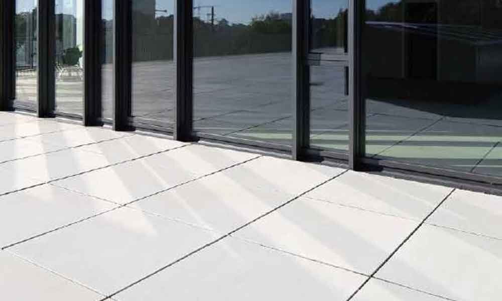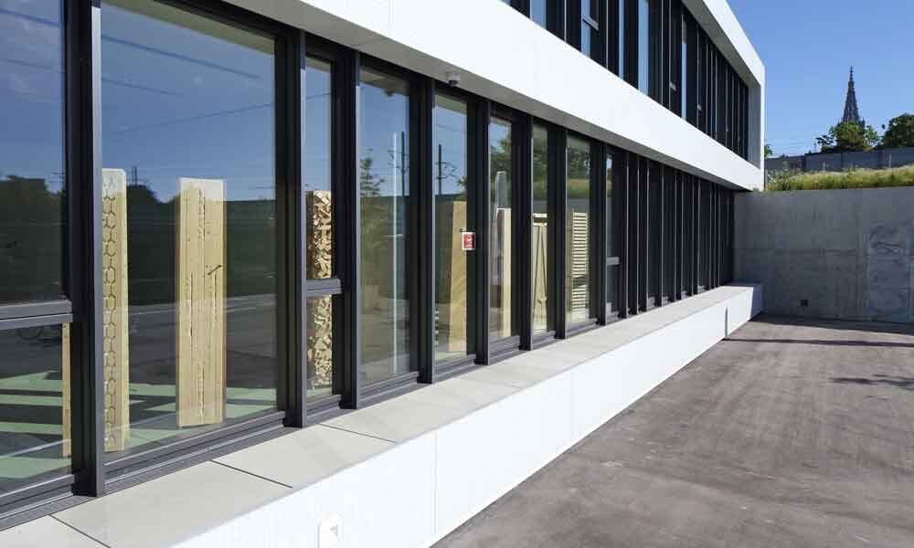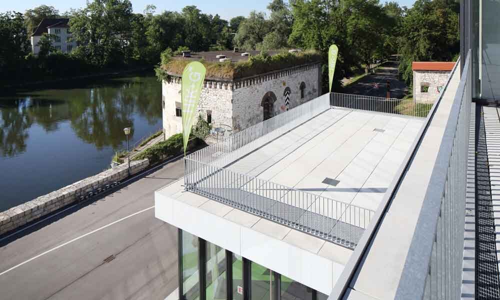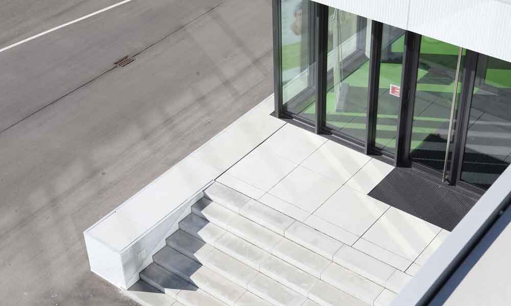 Die Baukörper wirken wie quasi gegeneinander verschobene Etagen und machen die Architekt einerseits besonders und andererseits geradlinig. Die Dachterrasse ist mit großen Sichtbetonplatten belegt, die die Weitläufigkeit der Fläche zusätzlich unterstreichen. Der puristische Baustoff zieht sich durch die Gestaltung des gesamten Gebäudes. So sind auch die Brüstungselemente und die Fensterbänke eigens in der Oberfläche des Plattenbelags erstellt worden. Die Eingangstreppe ist aus besonders rutschsicheren Blockstufen - sogenannten Blockstufen-Antirutsch - hergestellt.