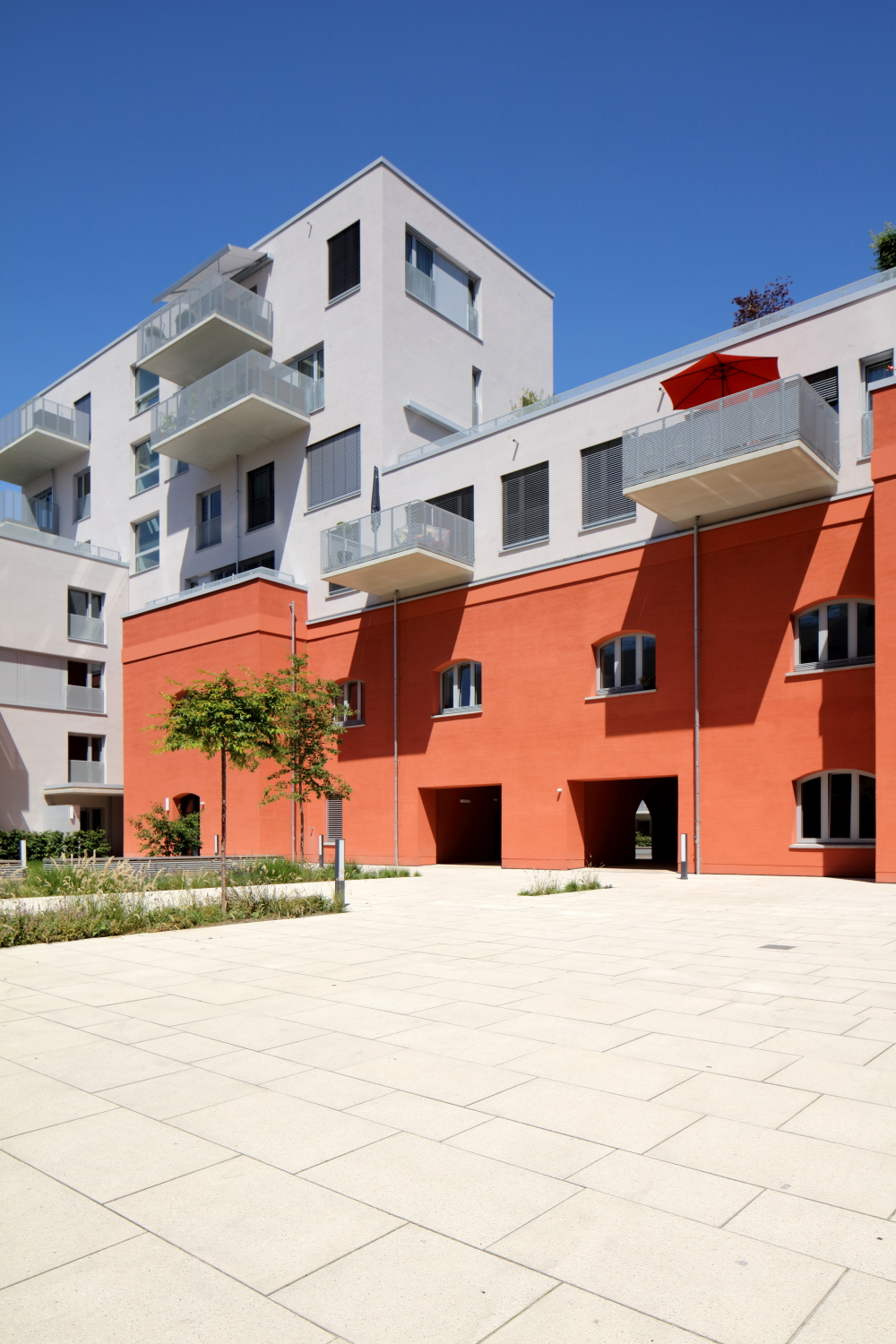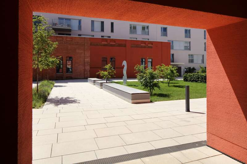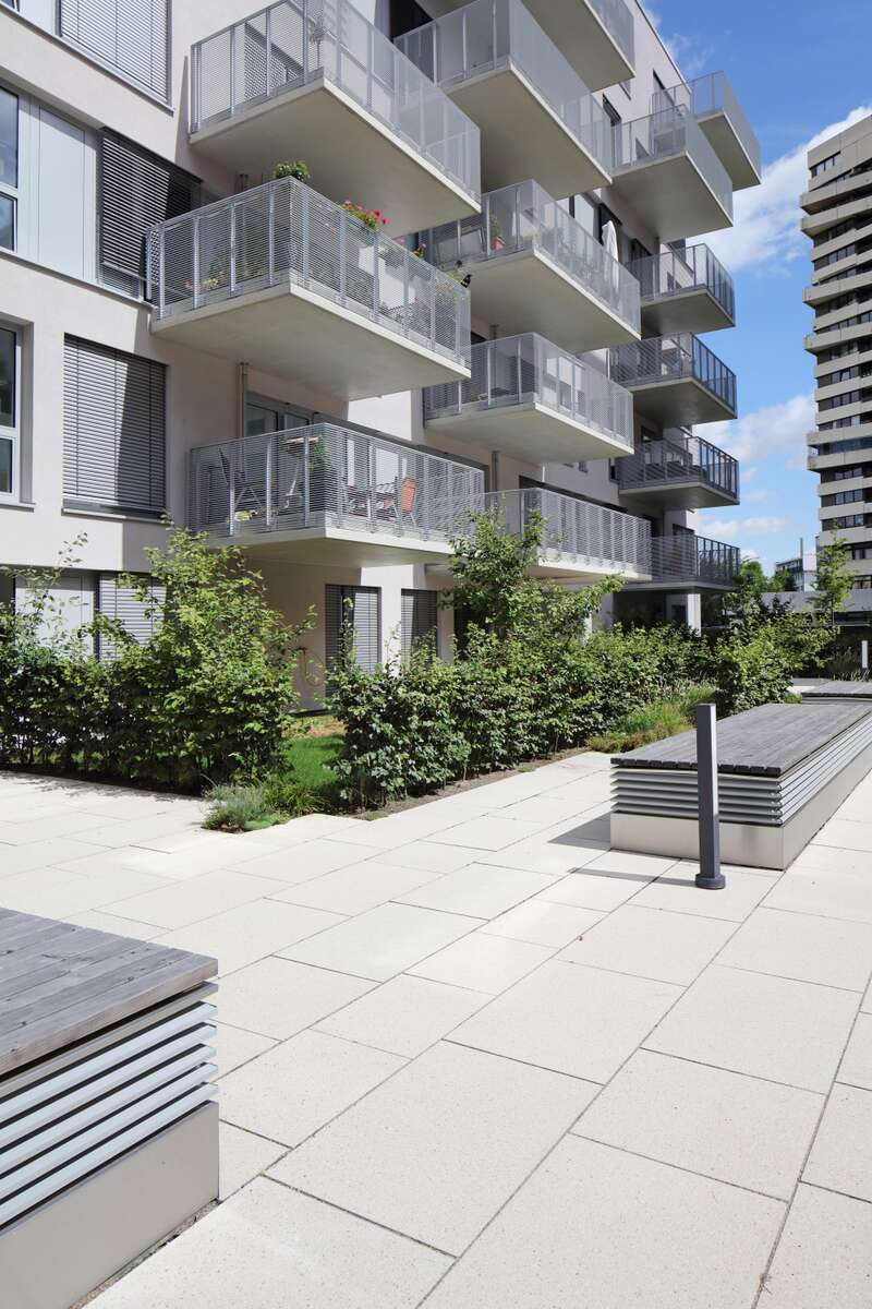 Der Neubau am Jahnufer bietet eine hohe Wohnqualität mit Ausblick auf die Donau. Das Objekt ist auf dem ehemaligen Gelände der Lebkuchen Weiss GmbH und der Flussmeisterei entstanden, wobei denkmalgeschützte Bestandsbauten aus dem Baujahr 1859 integriert wurden. Hierbei sind ca. 125 Wohnungen entstanden. Die Freianlagen wurden mit Lithonplus-Pflastersteinen der Produktlinie Rupal in der Konfiguration Diamant-gelb ausgestattet. Die verschiedenen Größen der Betonpflaster und der gelbliche Akzent verleihen dem ganzen Komplex einen sehr warmen, einladenden Touch. Außerdem verschmilzt der Betonstein in der Symbiose zwischen Alt und Neu und sorgt dabei für ein heterogenes, stimmiges Umfeld.